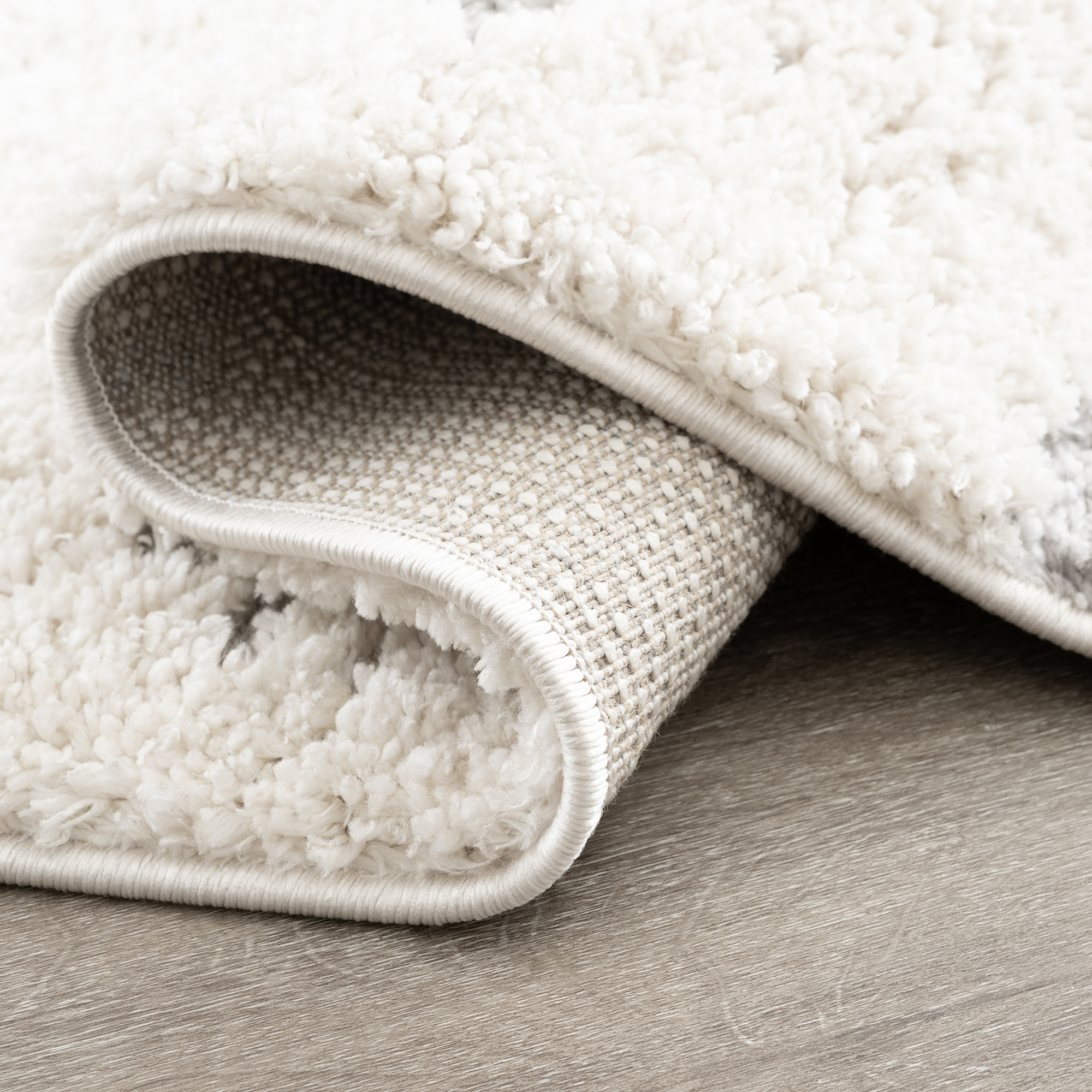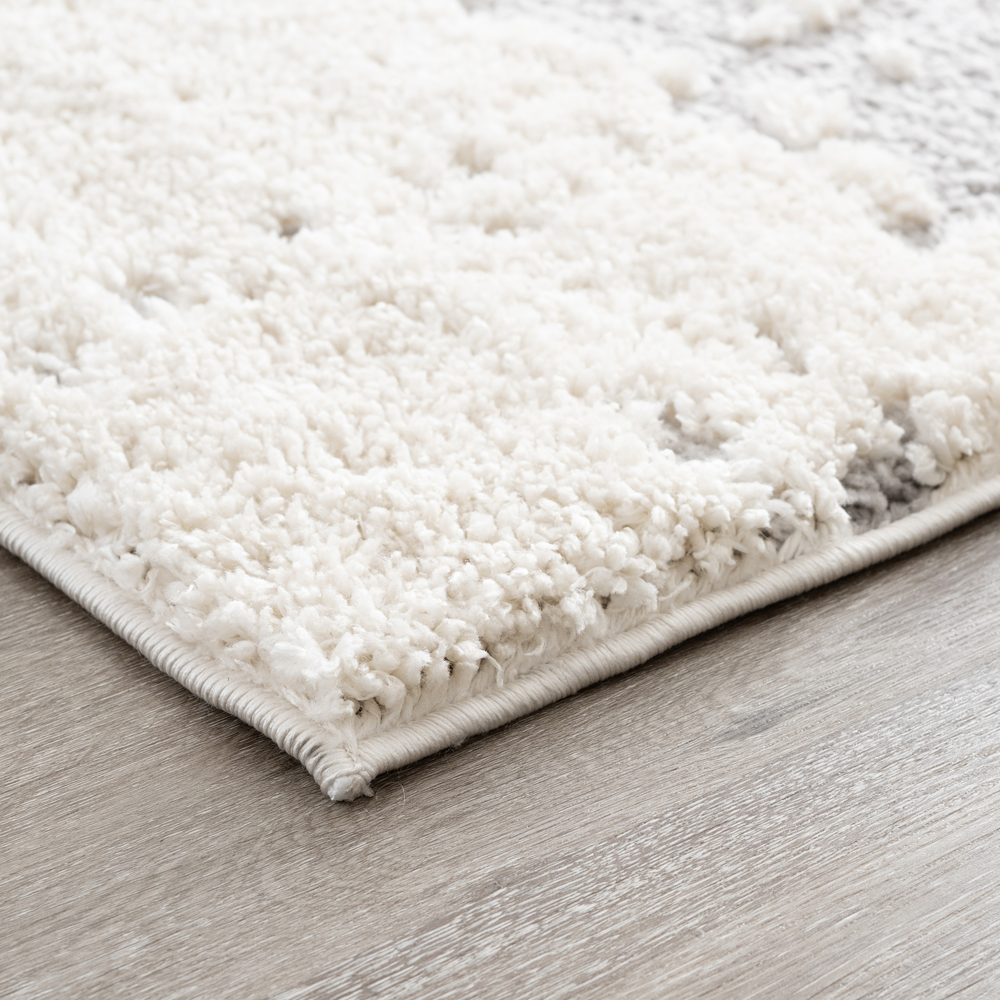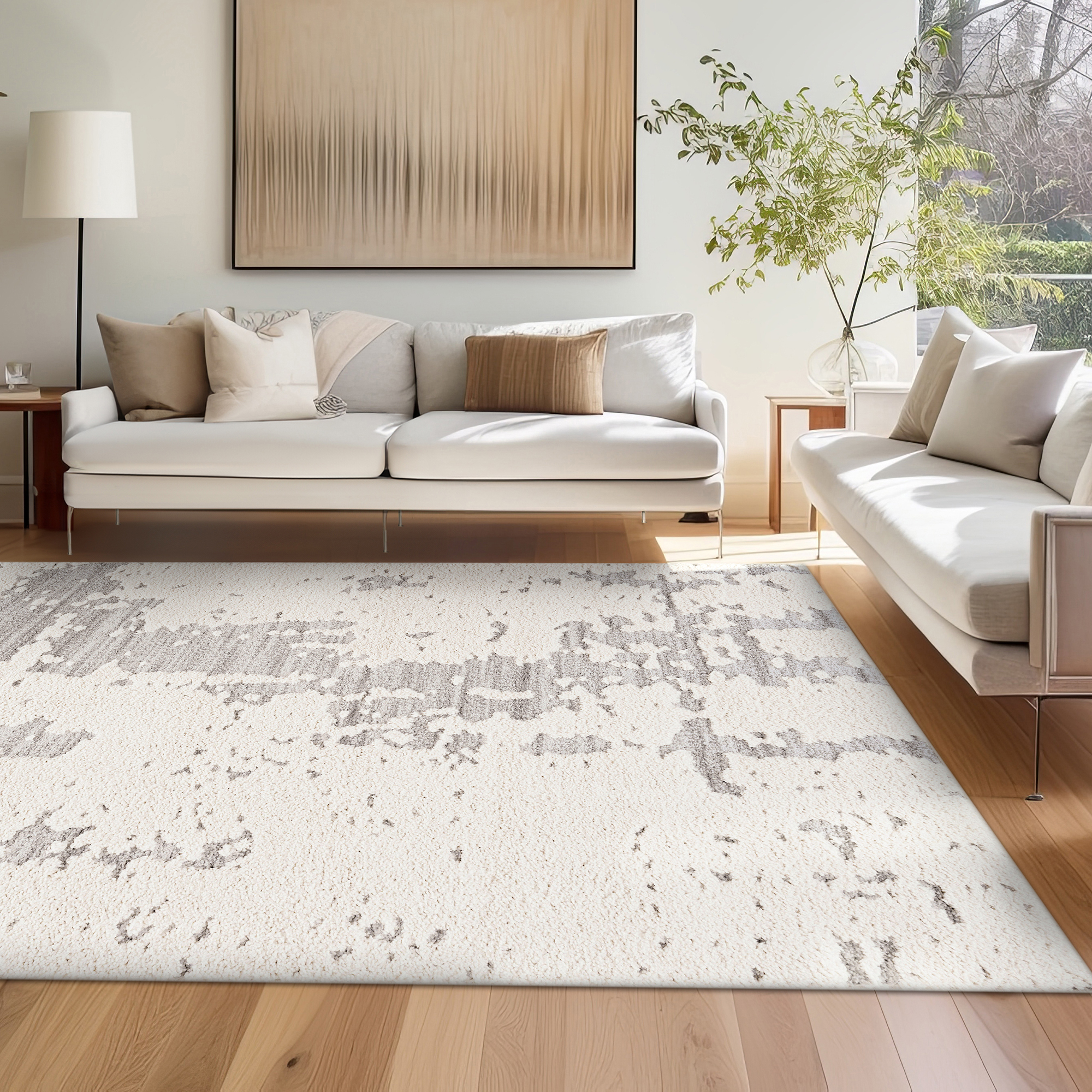 This contemporary shag indoor area rug features a plush polyester pile, providing a soft and luxurious feel underfoot. Its contemporary style adds a modern touch to your living space, making it a stylish addition to your home decor. The rug is backed with jute, which adds durability and stability to the overall structure. With its combination of comfort and trending aesthetics, this rug is not only a functional floor covering but also an attractive accent piece for any indoor setting. The rug is adorned with a unique distressed paint pattern, giving it a distinctive and modern look. The contemporary design adds a touch of sophistication to your home decor, making it an eye-catching focal point in any room.