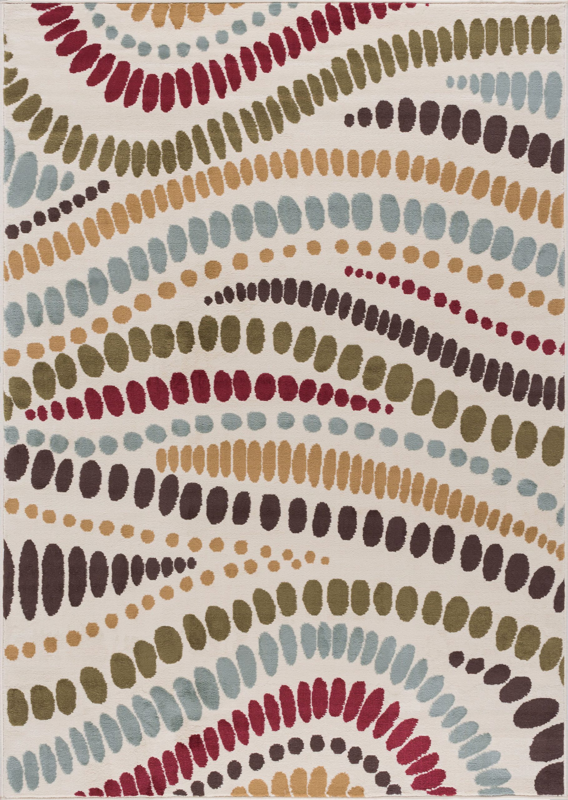 The energy of this area rug will refresh your senses and awaken your decor. The simple geometric design is represented in rich shades of green, brown, red, black and blue that pop on a beige background. This versatile pattern will complement many styles and settings, and is constructed of durable 100% polypropylene to allow placement in any room. Available in several individual sizes and as a three piece set so you can harmonize your theme throughout.
