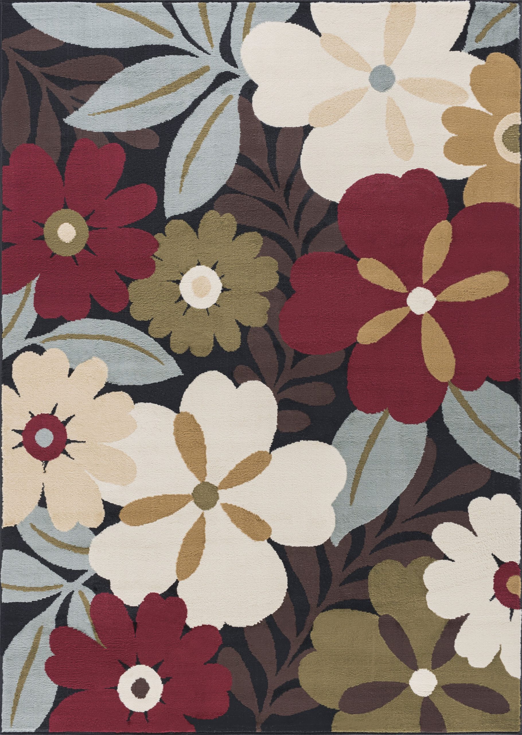 Add a natural element to your style with this area rug. This rug features an upbeat floral pattern in rich hues of beige, red, brown, and green set against a charcoal gray field. It offers a cheery addition to your home, and will fit in with any setting. The 100% polypropylene construction lends durability and versatility to this piece. This design is available in several individual sizes and as a three piece set so you can unify your look throughout your home.