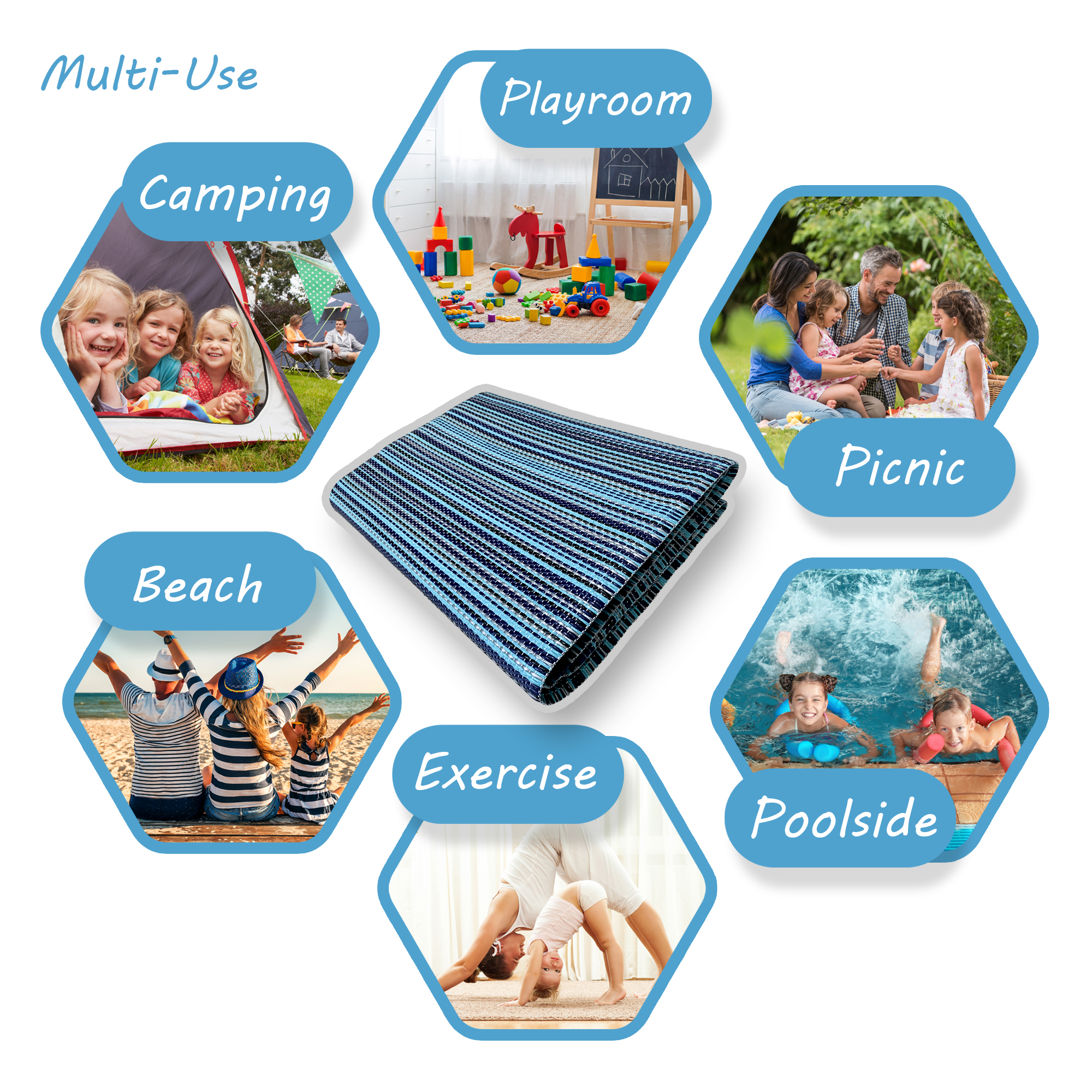 This multi-use foldable, waterproof outdoor rug is perfect for any adventure. Use this portable, reversible area rug mat for playroom, exercise, poolside, camping, or picnic. In a colorful candy stripe pattern. Natural stain-resistance and no additional treatments makes it kid and pet friendly. Vacuum or shake to remove debris. Spot clean or clean outside with water; spray with garden hose to rinse. Allow to dry thoroughly.