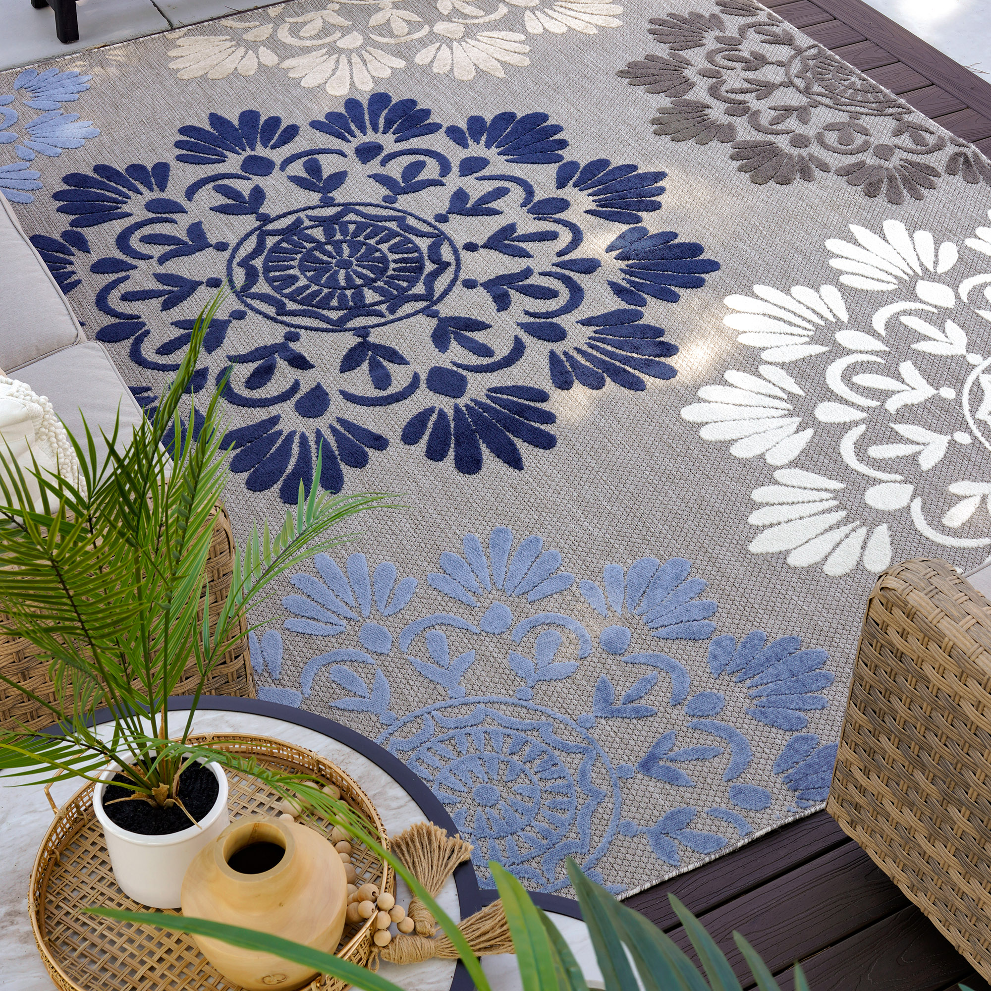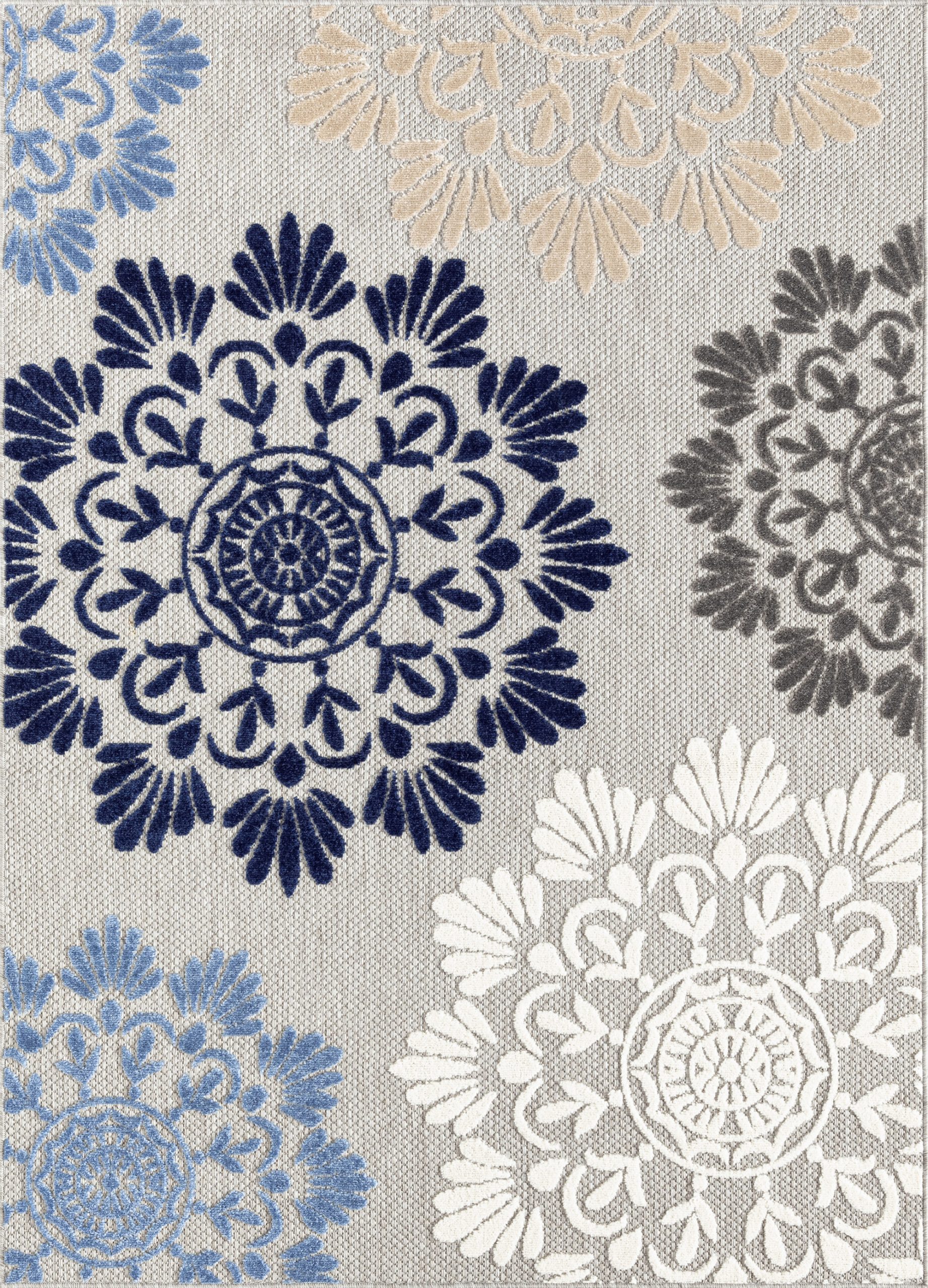The high-low pile combined with easy-care endurance of this colorful waterproof outdoor rug creates a relaxing space for your indoor or outdoor area. The modern floral suzani in a geometric pattern has a dynamic appeal.