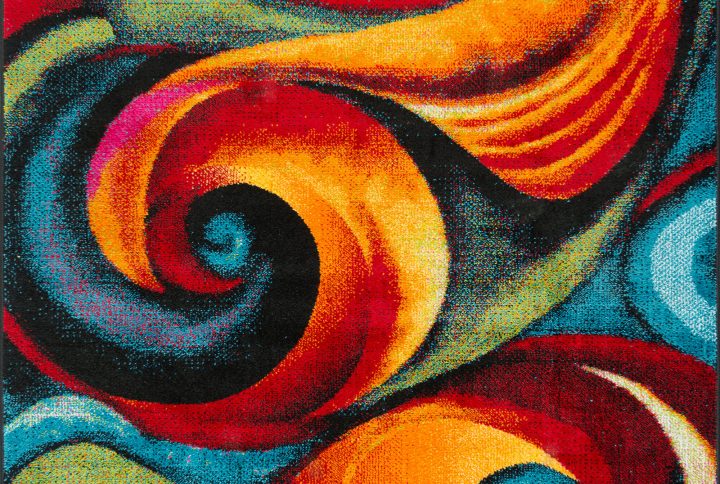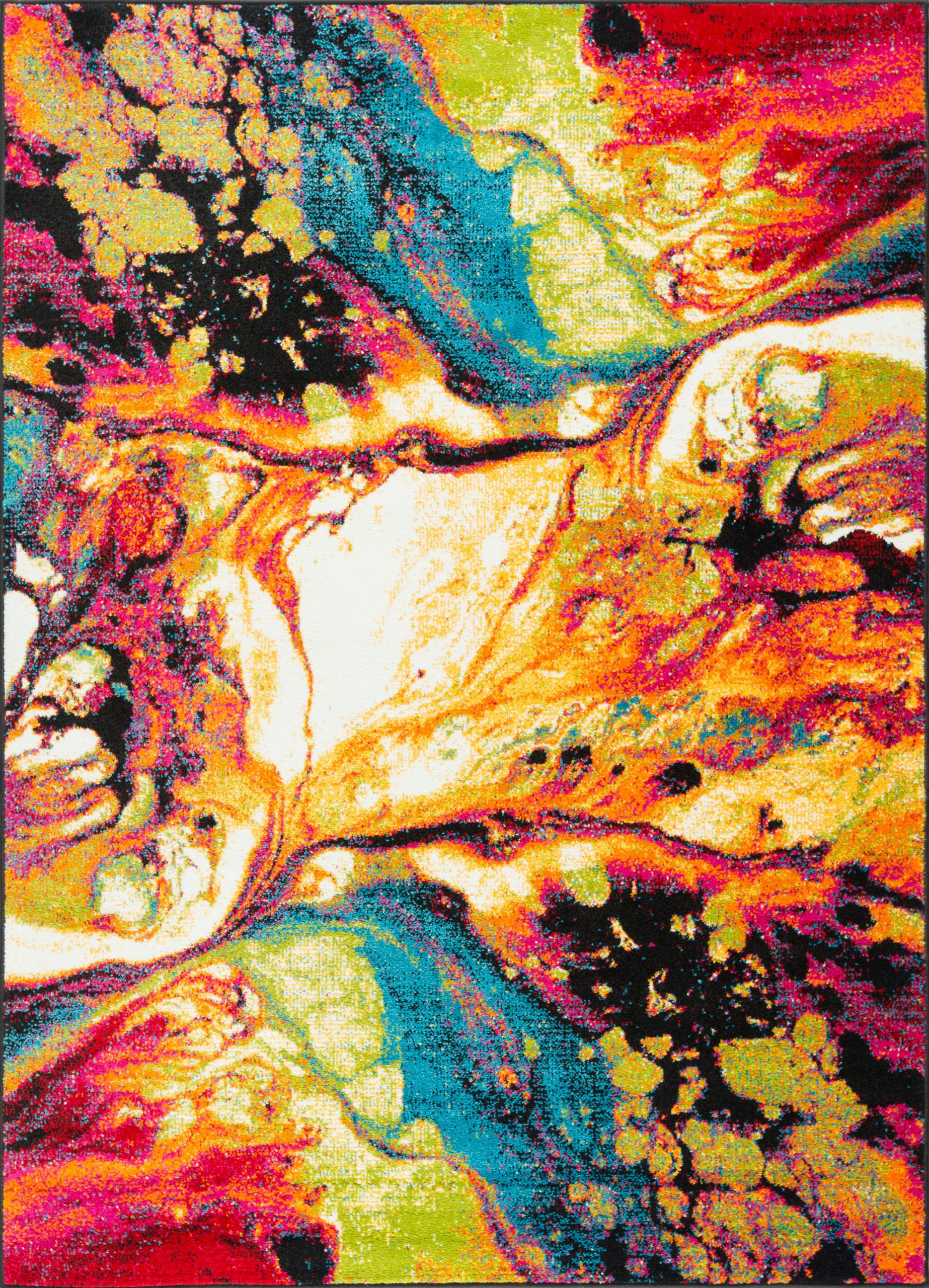This design creates a thought-provoking abstract area rug with an intermingling of several hues, to intelligently add an artistic touch to any setting. Made of soft 100% polypropylene fibers that are plush while also being stain-resistant and resilient. Magenta, cerulean blue, cadmium yellow, chroma green, electric orange, ink black, oxide red, and chalk white.