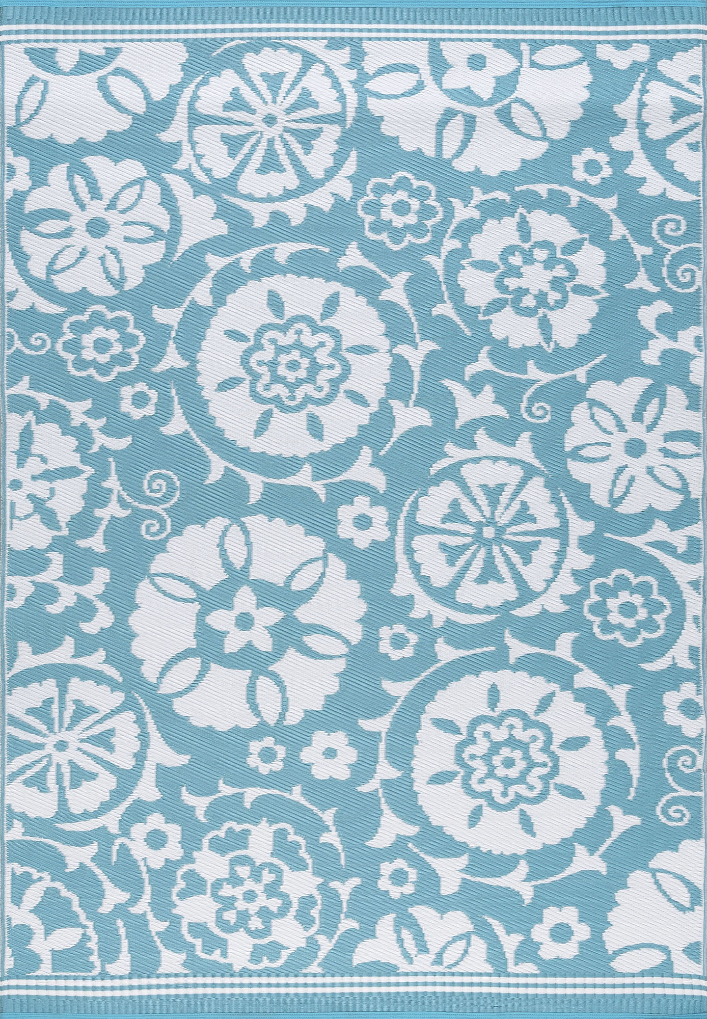 This fresh Suzani pattern indoor outdoor area rug is a stunning foundation for any relaxing room. Built to achieve and treated with UV resistance to stay vibrant. Perfect for a family room, sunroom, porch, deck, den, living room, playroom, nursery. May be cleaned outside with mild detergent and garden hose, allow to dry thoroughly. Spot clean with mild detergent and water when necessary.