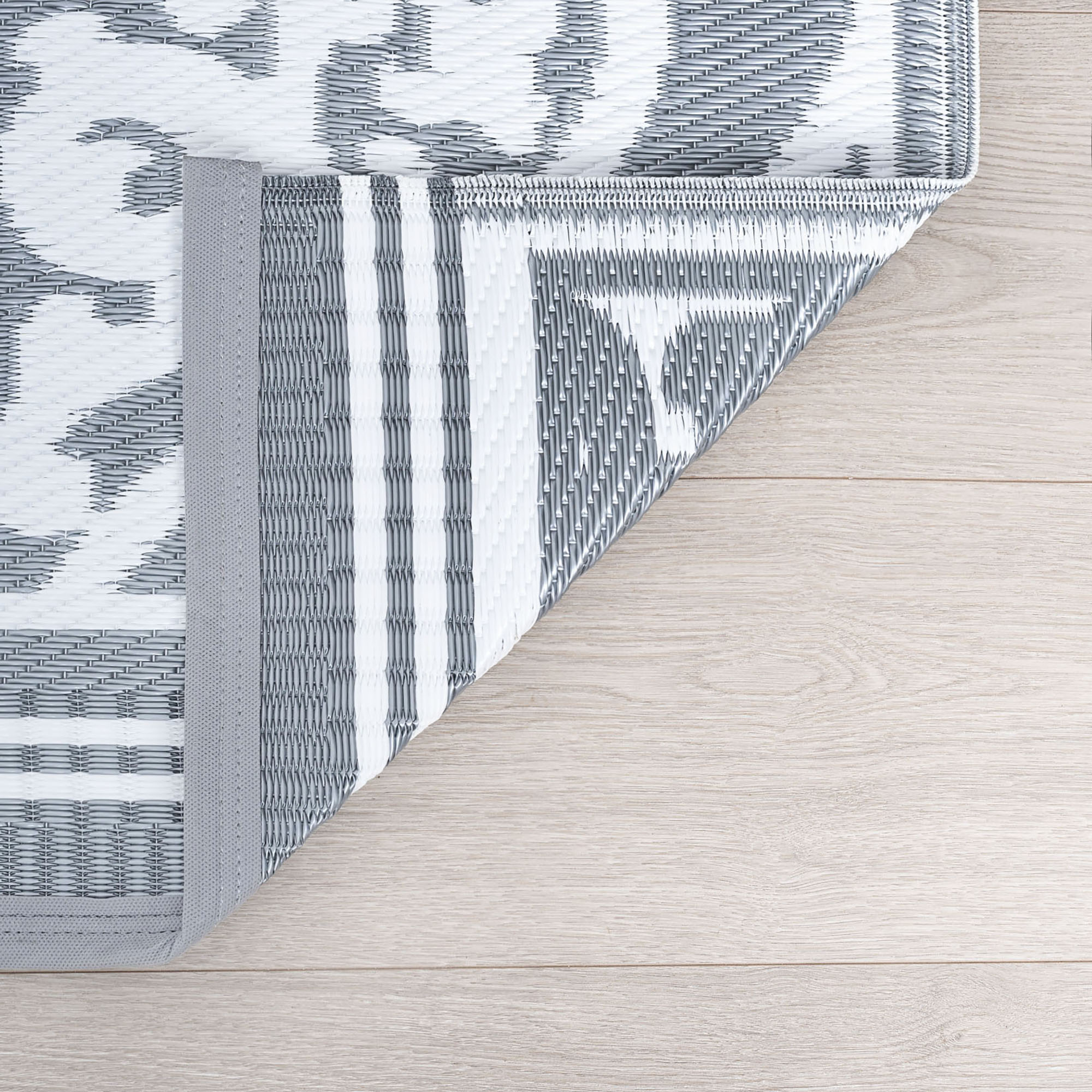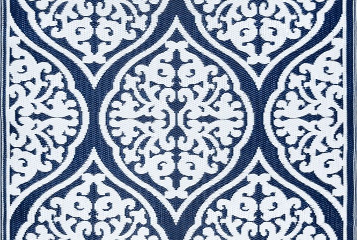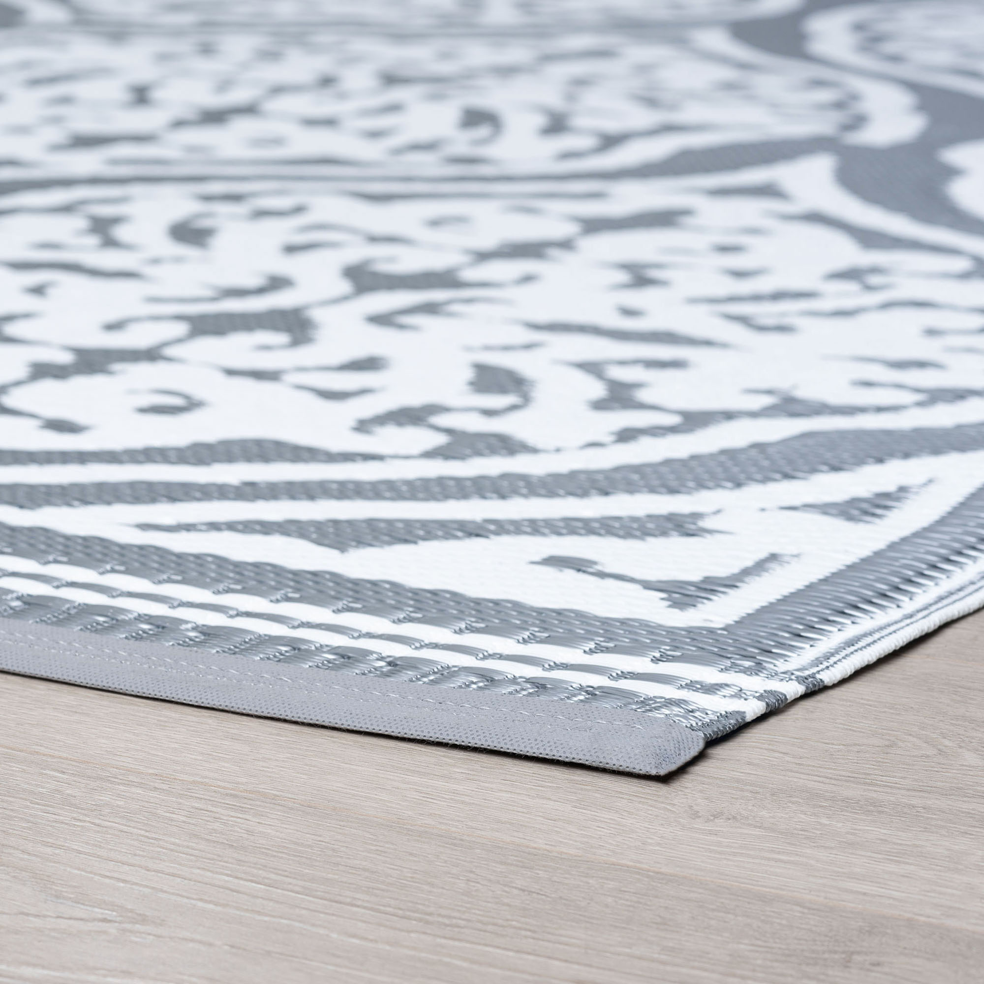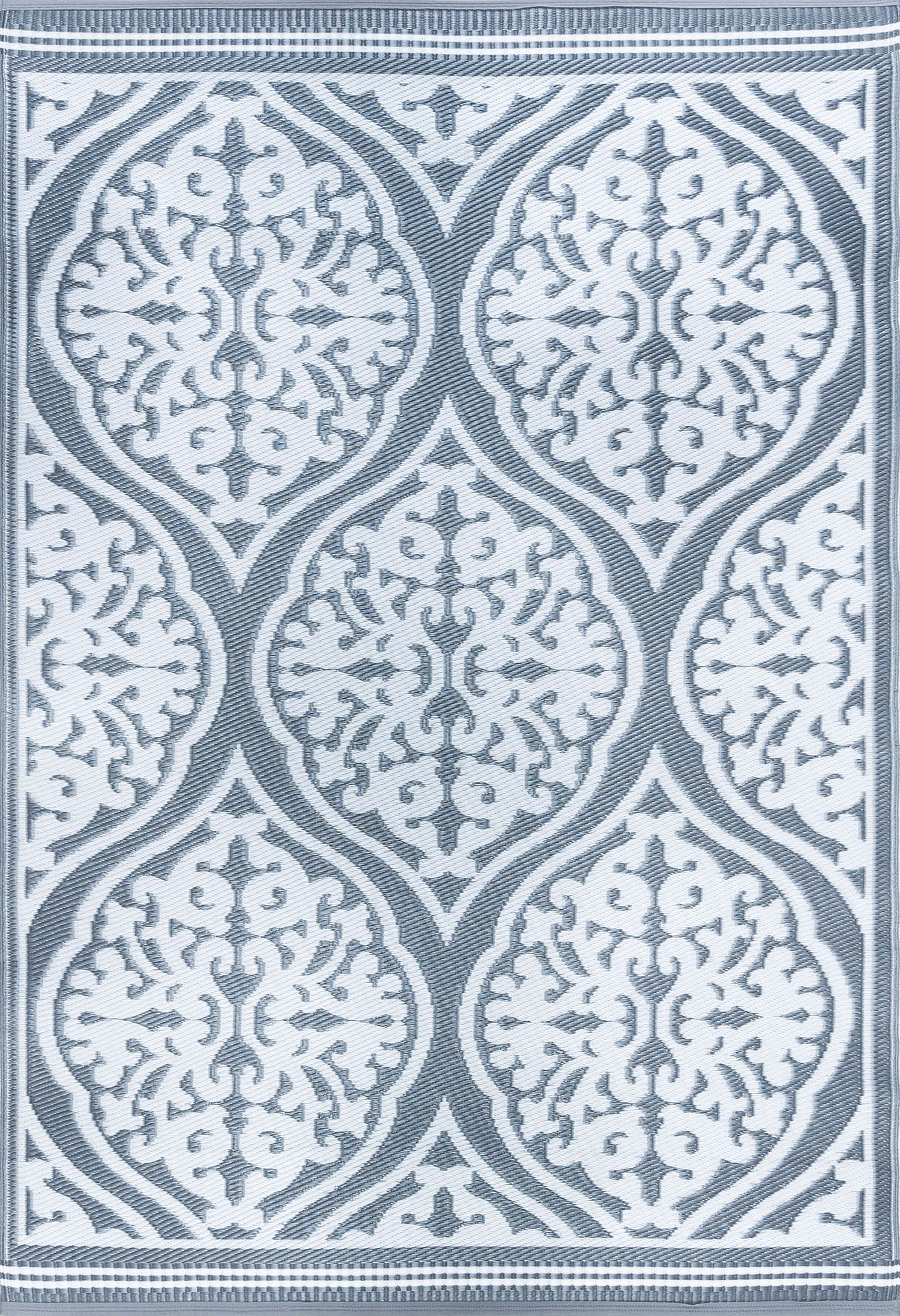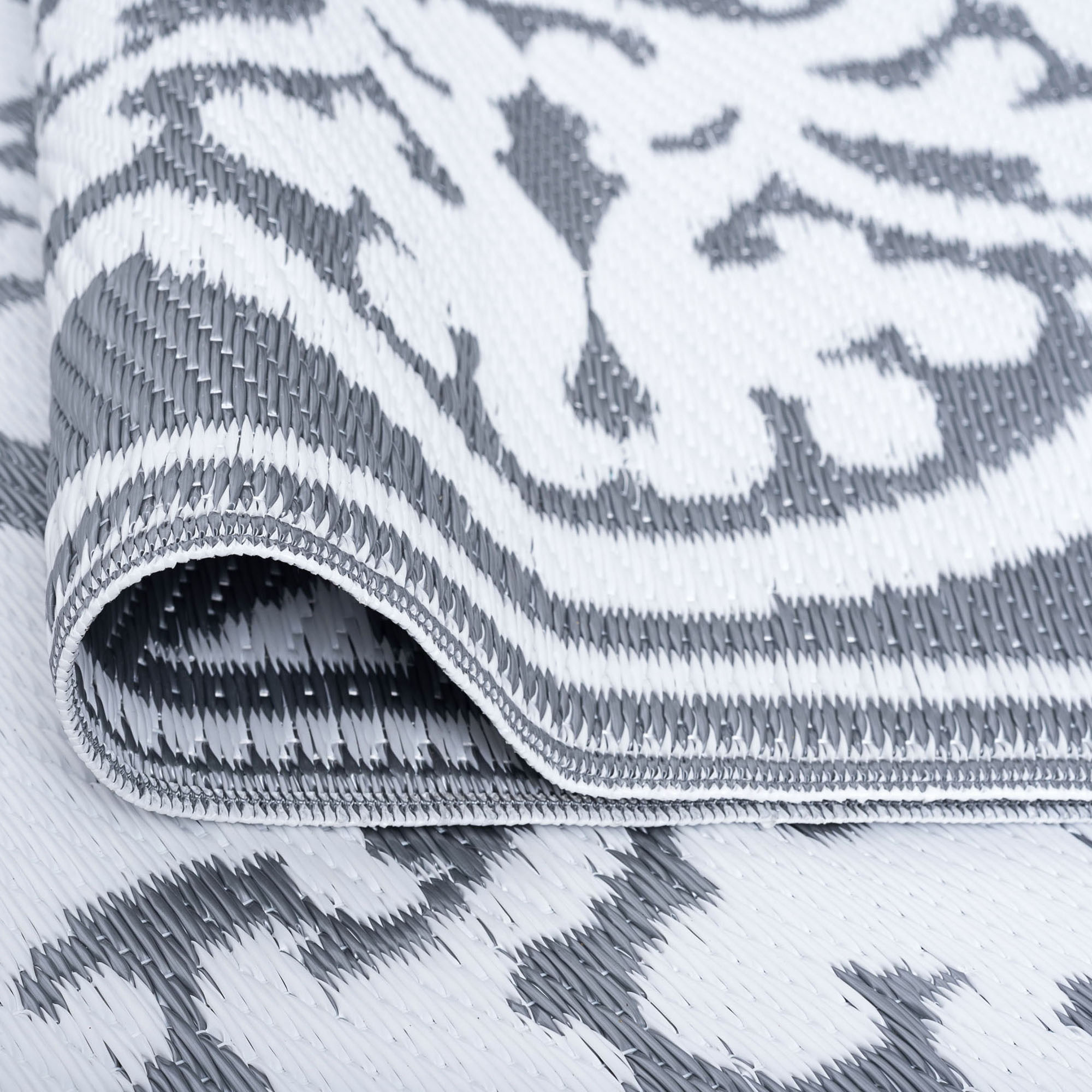 This ornate damask pattern indoor outdoor area rug adds a touch of refinement to any space. Built to achieve and treated with UV resistance to stay vibrant. Perfect for a family room, sunroom, porch, deck, den, living room, playroom, nursery. May be cleaned outside with mild detergent and garden hose, allow to dry thoroughly. Spot clean with mild detergent and water when necessary.