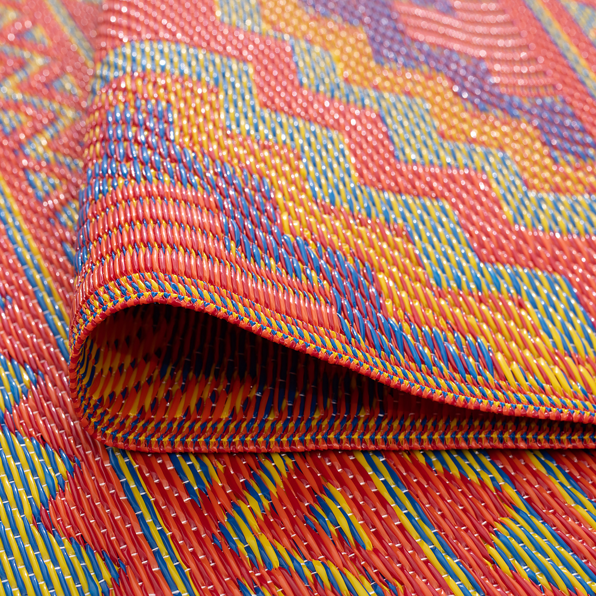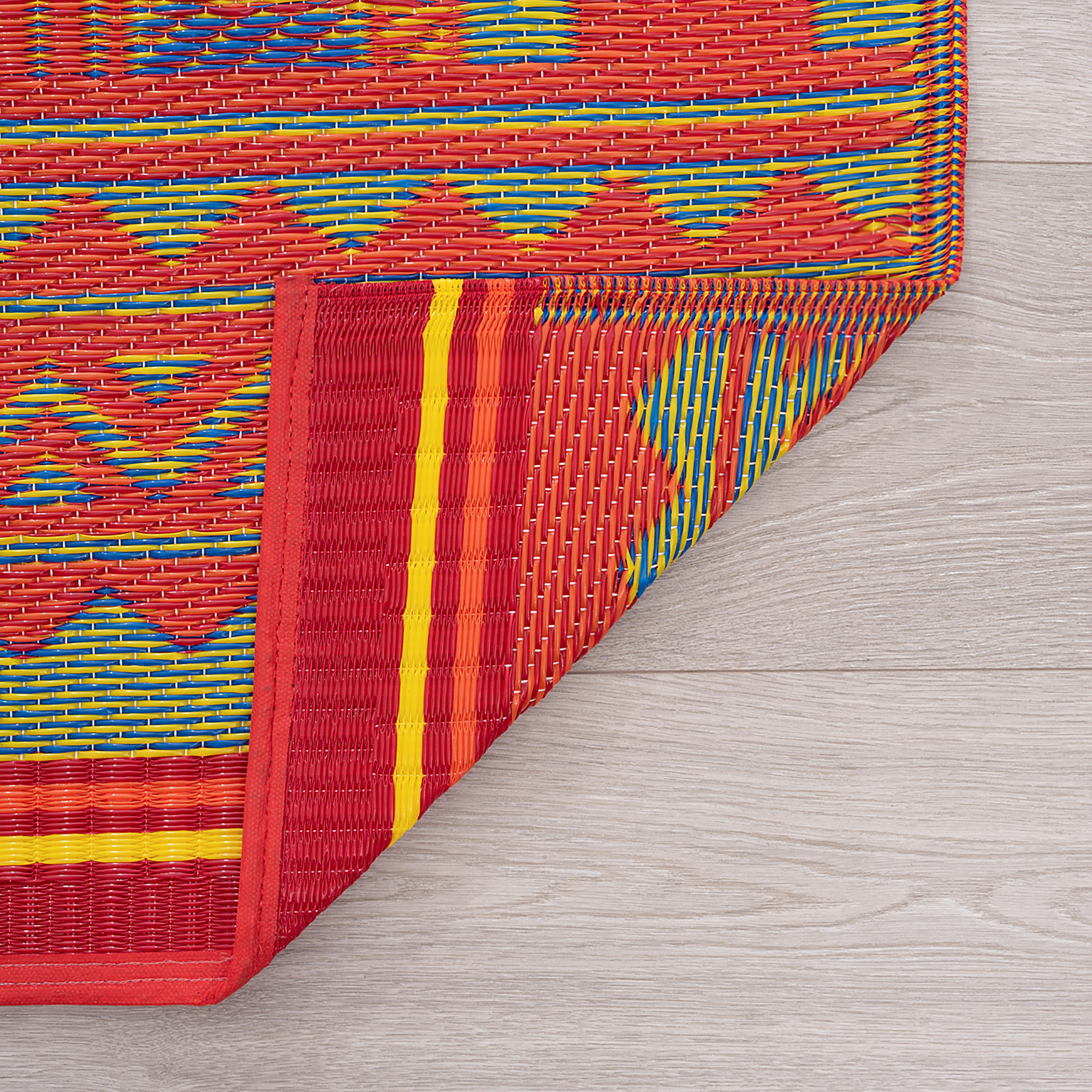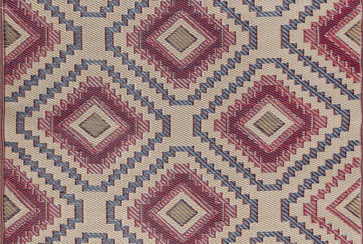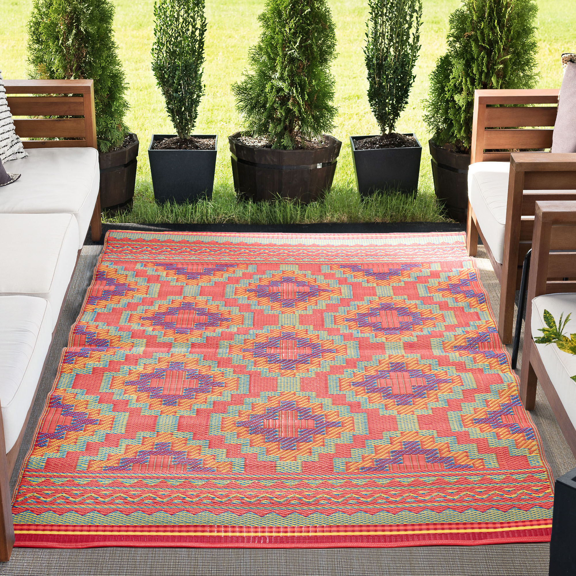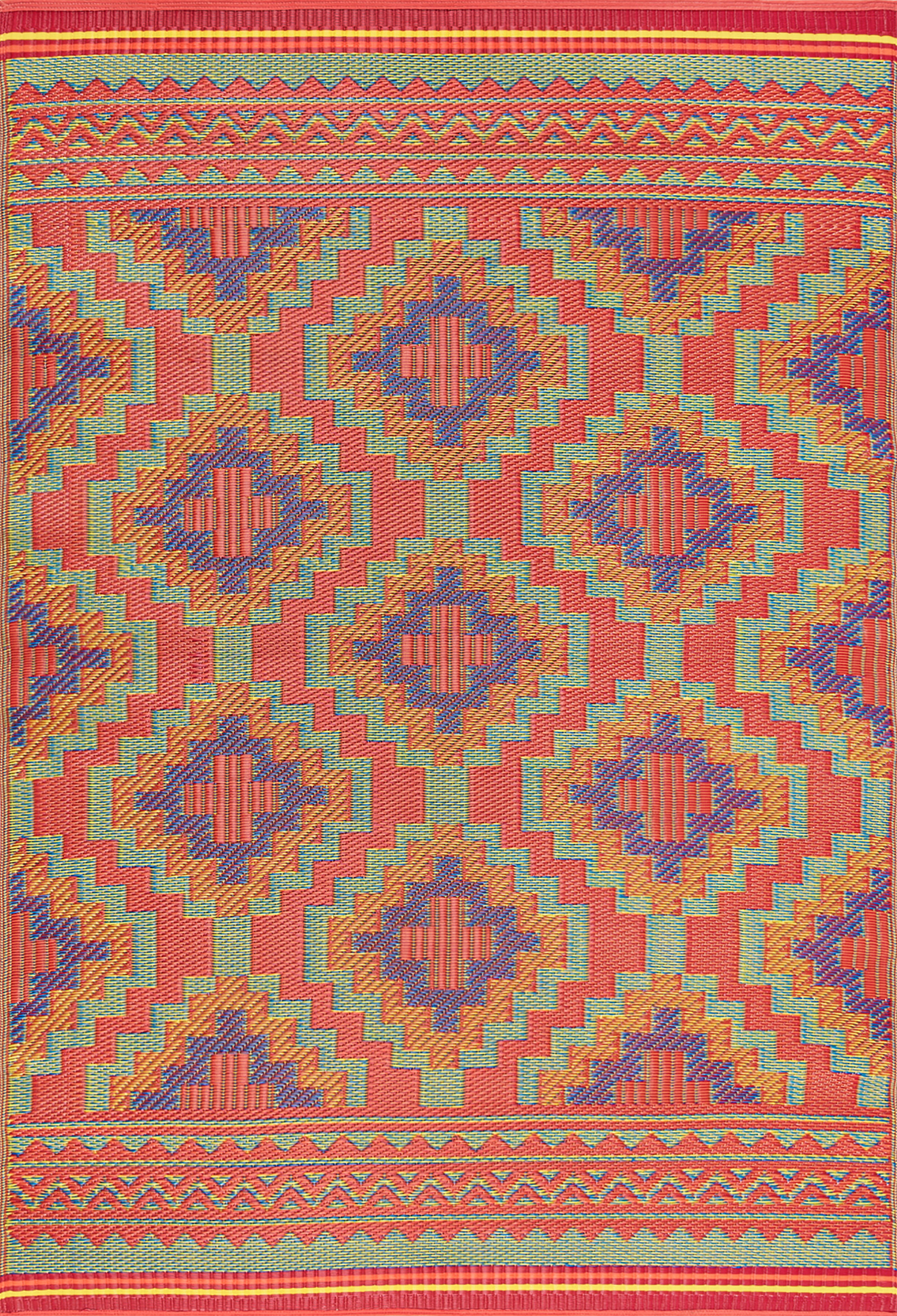 Bold geometric diamonds and vibrant colors form a statement piece in this contemporary indoor outdoor endurance area rug. Built to achieve and treated with UV resistance to stay vibrant. Perfect for a family room, sunroom, porch, deck, den, living room, playroom, nursery. May be cleaned outside with mild detergent and garden hose, allow to dry thoroughly. Spot clean with mild detergent and water when necessary.