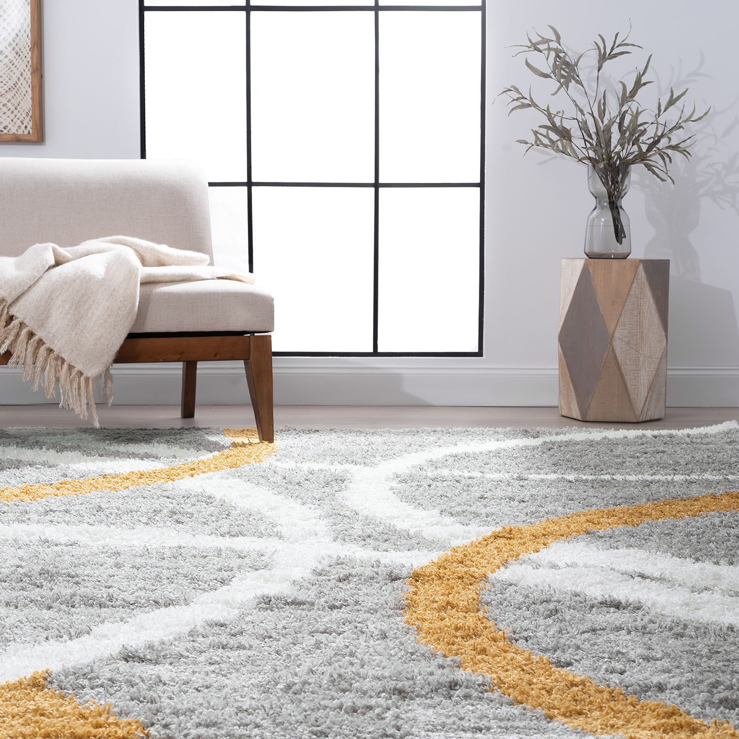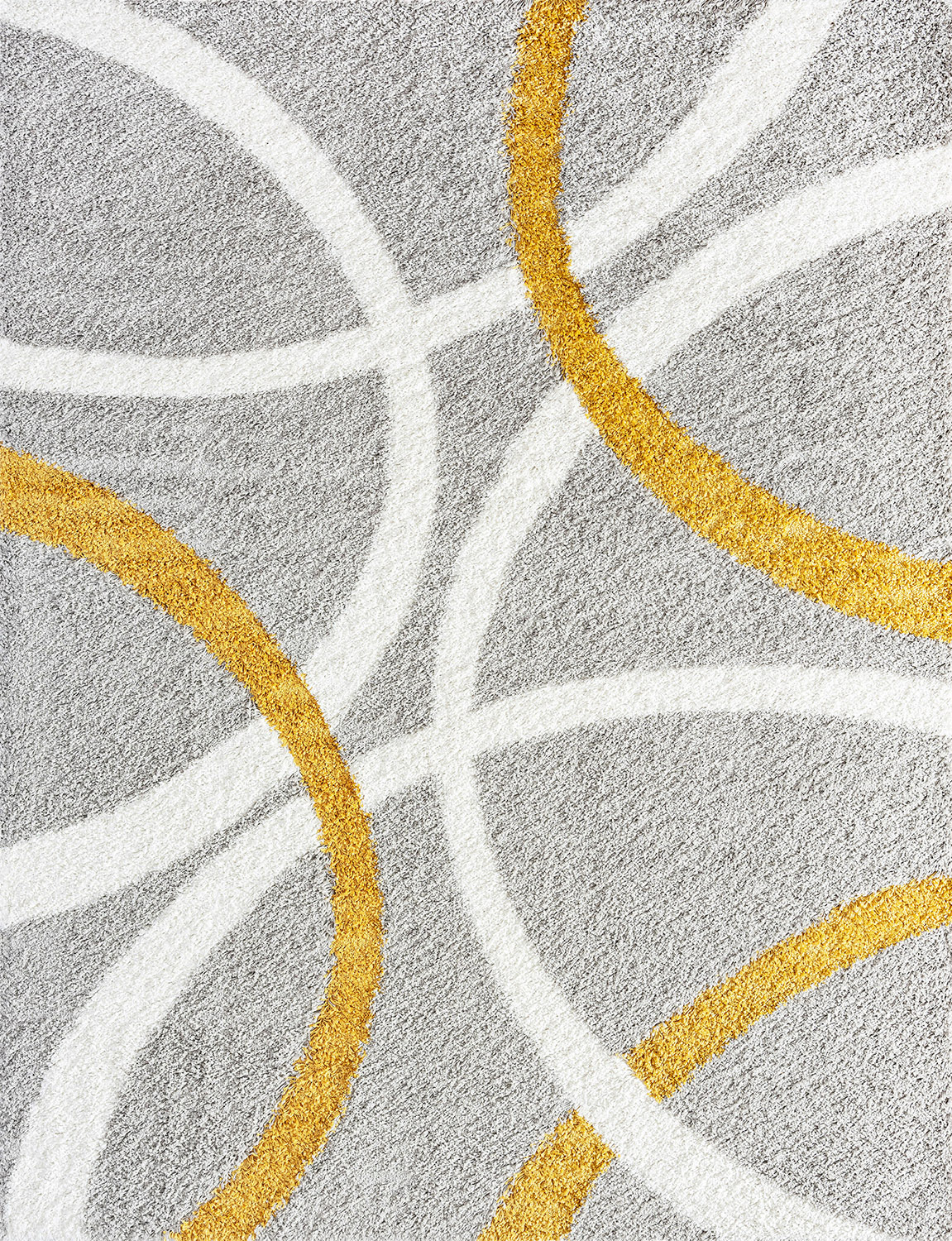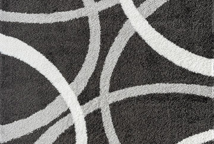 The abstract geometric pattern of deconstructed ribbon circles is a stunning design for this indoor shag area rug. The modern feel is a fresh update for traditional decor as well. Vacuum on high pile setting with no beater bar to remove debris taking care to avoid fraying the edges. Rotate periodically to extend the life of your investment.