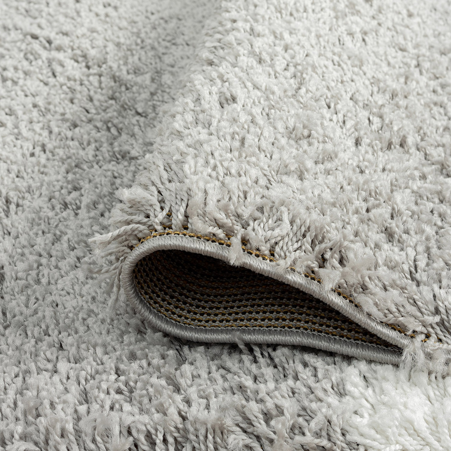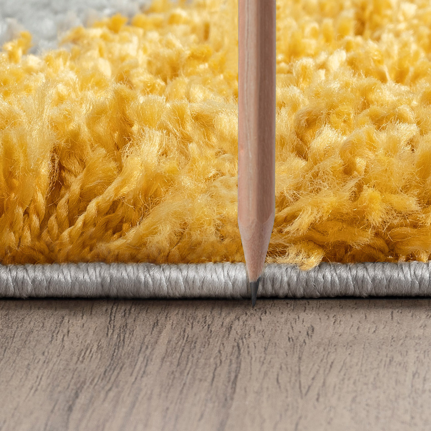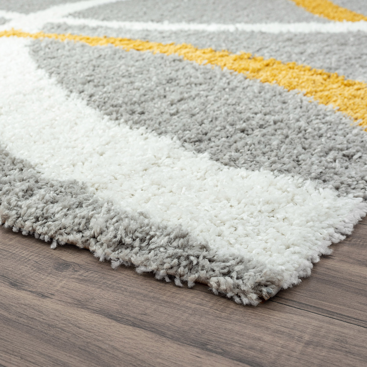 The abstract geometric pattern of deconstructed ribbon circles is a stunning design for this indoor shag area rug. The modern feel is a fresh update for traditional decor as well. Vacuum on high pile setting with no beater bar to remove debris taking care to avoid fraying the edges. Rotate periodically to extend the life of your investment.