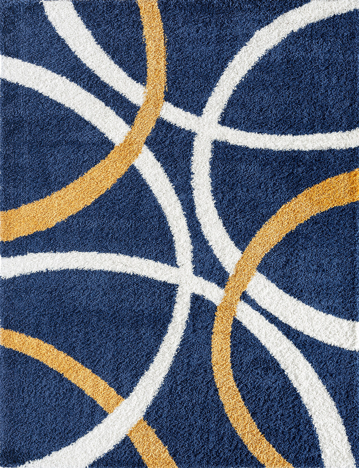 The abstract geometric pattern of deconstructed ribbon circles is a stunning design for this indoor shag area rug. The modern feel is a fresh update for traditional decor as well. Vacuum on high pile setting with no beater bar to remove debris taking care to avoid fraying the edges. Rotate periodically to extend the life of your investment.