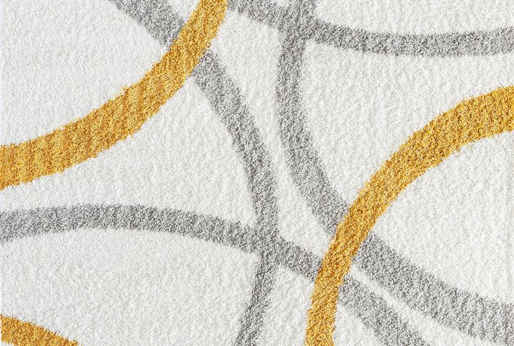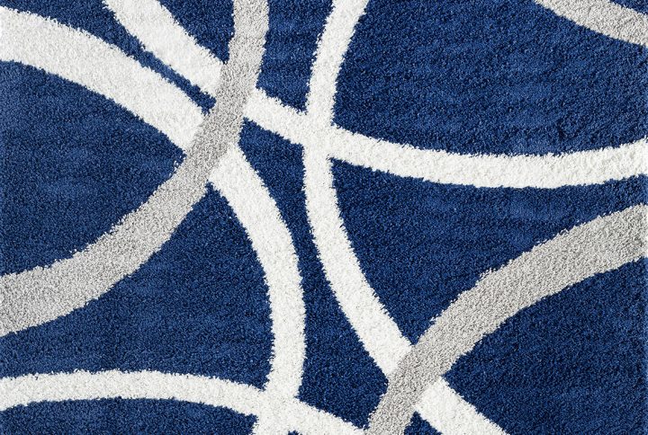 The abstract geometric pattern of deconstructed ribbon circles is a stunning design for this indoor shag area rug. The modern feel is a fresh update for traditional decor as well. Vacuum on high pile setting with no beater bar to remove debris taking care to avoid fraying the edges. Rotate periodically to extend the life of your investment.